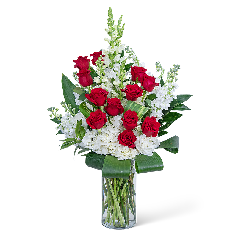 Love Story is a "wow" arrangement! It is ultimate beauty and perfection! It features a dozen roses, Hydrangea, Snapdragons, Stock, Aspidistra, and other premium foliage. Roses symbolize love and hope and are the perfect anniversary gift or gift of love.