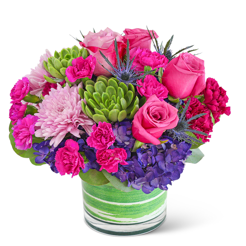 Delight in the rich purple tones of one of our floral favorites, Luminous London with Succulents. A chic, leaf-lined vase with hydrangea, roses, carnations, succulents, and premium foliage makes up this lavish floral design. This vibrant flower arrangement will brighten anyone's day and add a pop of color to any space. It would make a perfect Anniversary or Birthday gift for that special someone.