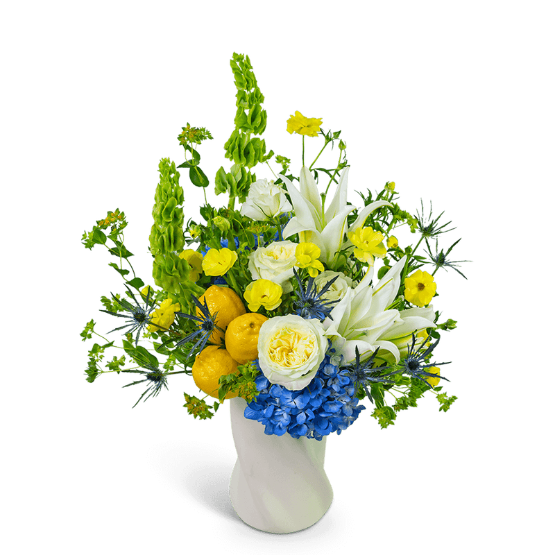 Luna Citrus is a bright and artful mix of Roses, Lilies, Bells of Ireland, and lemon accents in a modern white ceramic vase. This unique flower arrangement is perfect for celebrations, housewarmings, or sending a refreshing surprise with local flower delivery. Our floral designer may make thoughtful substitutions while maintaining the overall look of the arrangement.
