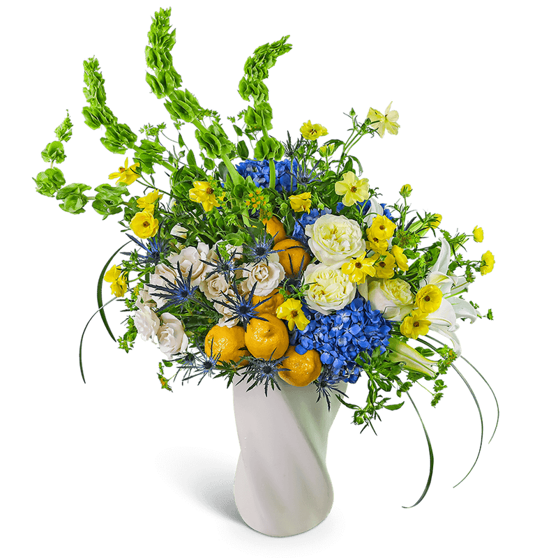 Luna Citrus Couture is a bright and artful mix of Roses, Lilies, Bells of Ireland, and lemon accents in a modern white ceramic vase. This unique flower arrangement is perfect for celebrations, housewarmings, or sending a refreshing surprise with local flower delivery. Our floral designer may make thoughtful substitutions while maintaining the overall look of the arrangement.