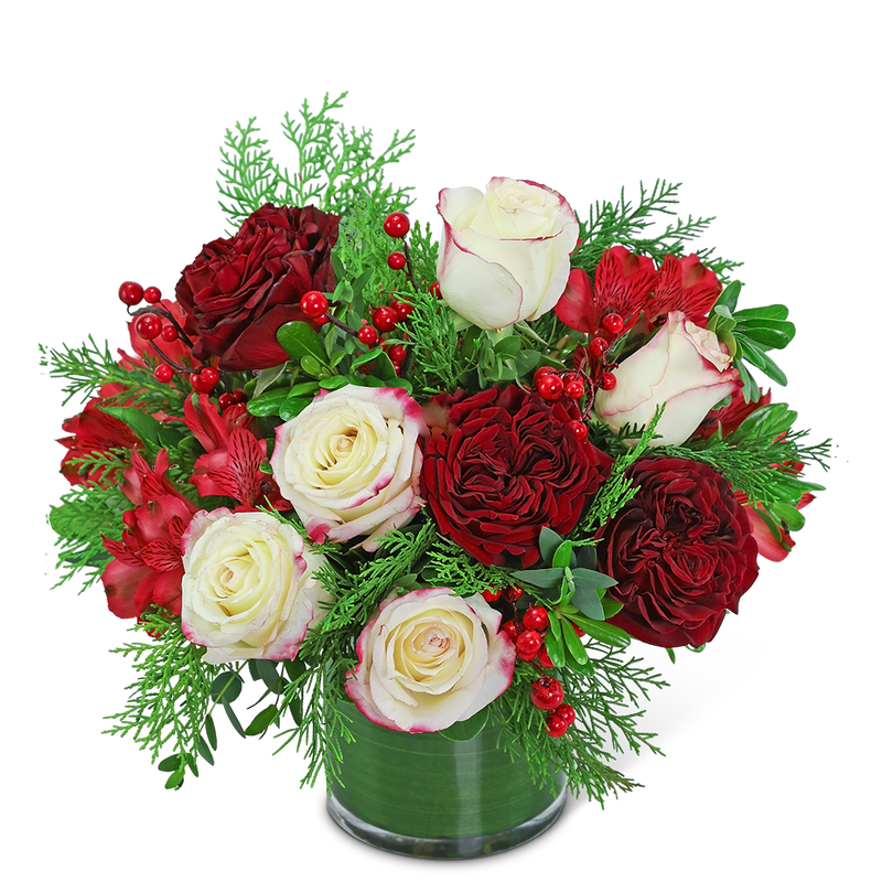 The rich, romantic colors of Luxe Peppermint Mocha are sure to melt the heart of your loved one. Beautiful ruffly roses, alstroemeria, and other premium flowers and winter foliage are artfully arranged in a leaf-wrapped vase. Flower delivery has never been easier or more appreciated. Whether you are looking for a birthday, anniversary, or valentines day gift, we have flowers that are sure to fit the occasion!