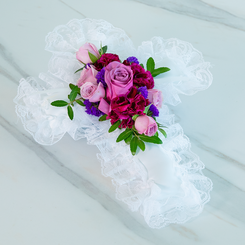 Embrace the serene beauty of our Majestic Cross Pillow, adorned with beautiful roses, carnations, and premium foliage. This elegant arrangement, displayed on a delicate Lace and Satin Cross Pillow, conveys sympathy, comfort, and peace as it rests gently in the casket. Perfect for honoring a loved one, it offers a timeless floral tribute and a gentle expression of condolence.