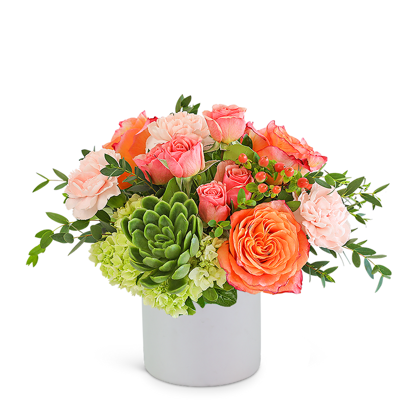 Send a message of love and magic with this beautiful flower arrangement. Brighten someone's day with the creatively designed Malibu Magic flower arrangement. Its highlighted flowers include Free Spirit Roses, carnations, hydrangea, spray roses, succulents, and assorted foliage. A stunning arrangement of fresh flowers is designed to brighten the room and lift the spirit, making someone's birthday or get-well gift extra special.