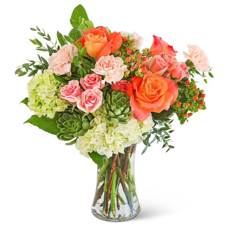 Send a message of love and hope with this beautiful flower arrangement. Brighten someone's day with the Malibu Sun with Succulents flower design. Its highlighted flowers include Free Spirit Roses, carnations, hydrangea, spray roses, succulents, and assorted foliage. A stunning arrangement of fresh flowers is designed to brighten the room and lift the spirit, making someone's birthday or get-well gift extra special.