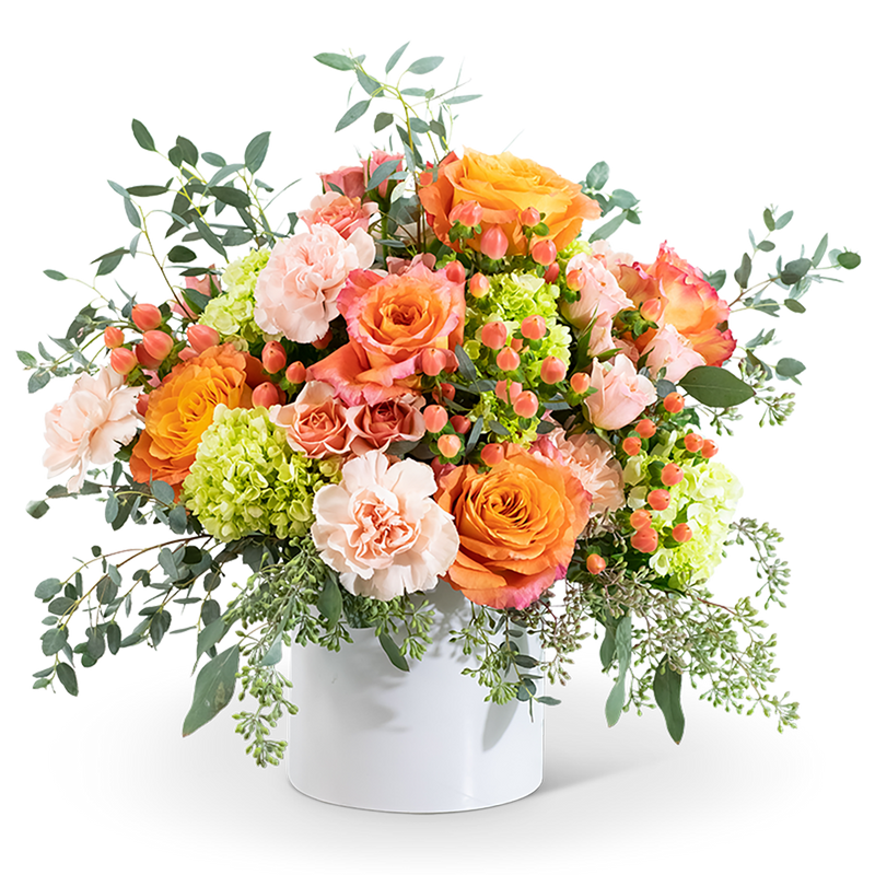 Looking for the perfect birthday or new baby gift? Make someone's day with the creatively designed Malibu Sunset arrangement. Its highlighted flowers include Free Spirit Roses, peach carnation, hypericum berries, peach spray roses, mini green hydrangea, and different varieties of eucalyptus. It's a great gift to send for any occasion.