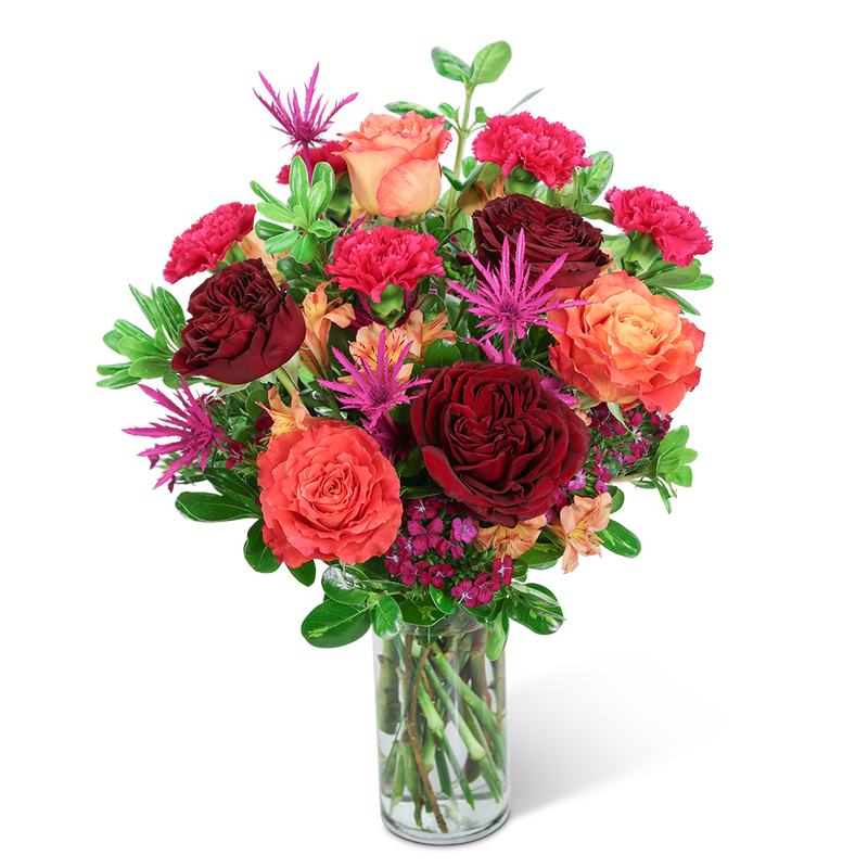 Add bold color to your life with our Mango Playa design. Our hand-arranged floral design is the perfect way to show someone special how much you care. It features gorgeous reds, pinks, and oranges in a combination of Roses, Carnations, Alstroemeria, Dianthus, and premium foliage. This sweet, colorful arrangement is the perfect statement piece for a dining room table or kitchen island.