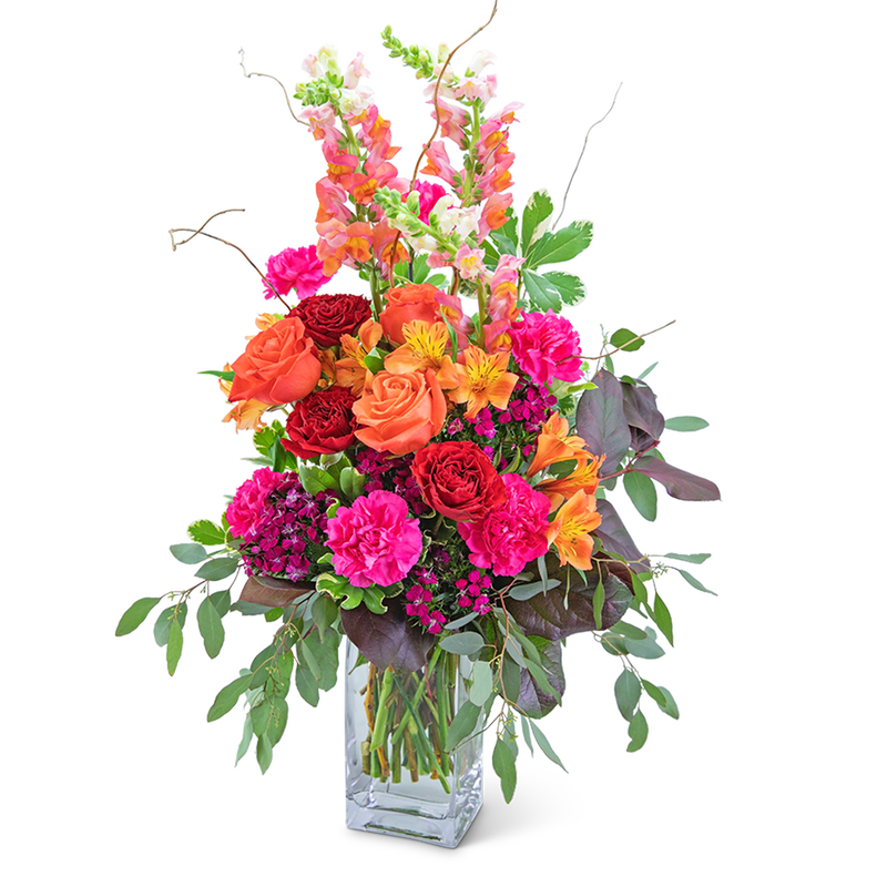 Mango Showstopper may look good enough to eat but it's even more beautiful to display! This arrangement is a vibrant collection of Myra and orange roses, carnations, alstroemeria, snapdragons, and dianthus accented with curly willow and a variety of foliage in a clear rectangular vase. This large, colorful arrangement would make quite a statement on an entryway or dining room table.