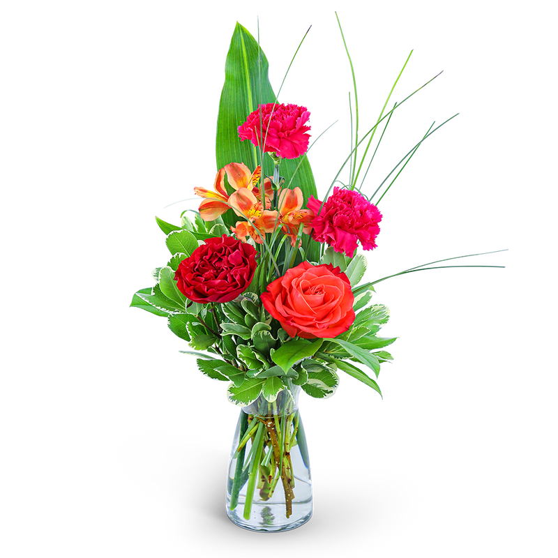 Add bold color to your life with our Mango Split design. Our hand-arranged, floral design is the perfect way to show someone special how much you care. It features gorgeous reds, pinks, and oranges in a combination of Roses, Carnations, Alstroemeria, and premium foliage. This sweet, colorful arrangement is the perfect statement piece for a side table or desk.