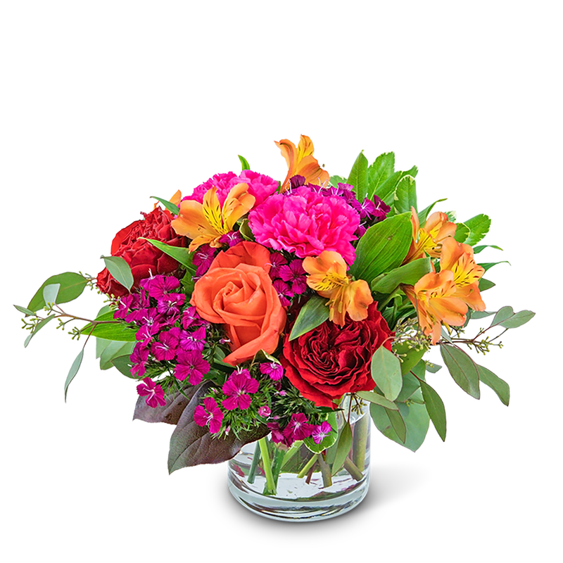 Mango Sunrise may look good enough to eat but it's even more beautiful to display! This vibrant collection contains Myra and orange roses, carnations, alstroemeria, and dianthus accented with a variety of foliage in a clear cylinder container. This colorful arrangement would be perfect on a side table or desk.