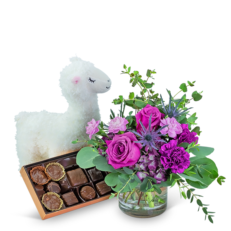 Mod Magenta Gift Ensemble is for the Llama lover in your life! It features rich tones of purple hydrangea, roses, and carnations complemented by a variety of green foliage. The arrangement is accompanied by a white, plush Llama and a box of the finest chocolates. *Items may vary depending on availability.