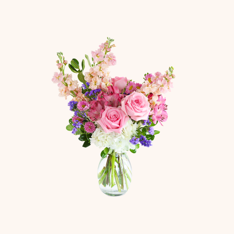 Spread love and joy with our exquisite Sweet Bunch of Love Bouquet. Delicate pink roses, Alstroemeria, and Hydrangea are artfully arranged in a clear glass vase, creating a beautiful and tender look that is sure to bring a smile to anyone's face. With its pop of pastel colors, this unique flower arrangement is perfect for adding a touch of soft elegance to any occasion.