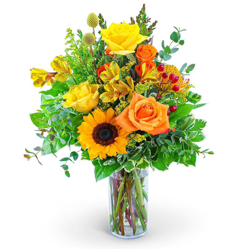 Morning Thyme is a beautiful hand-arranged bouquet that will deliver sunlit happiness to someone's doorstep. It has a mix of colorful blooms, like Roses, Sunflowers, Pincushion Protea, Craspedia, Alstroemeria, and premium foliage in a clear glass vase. Whether celebrating a birthday, new baby, or retirement, this arrangement will add just the right touch of warmth to your celebration. We offer the best fresh flower delivery service in town!