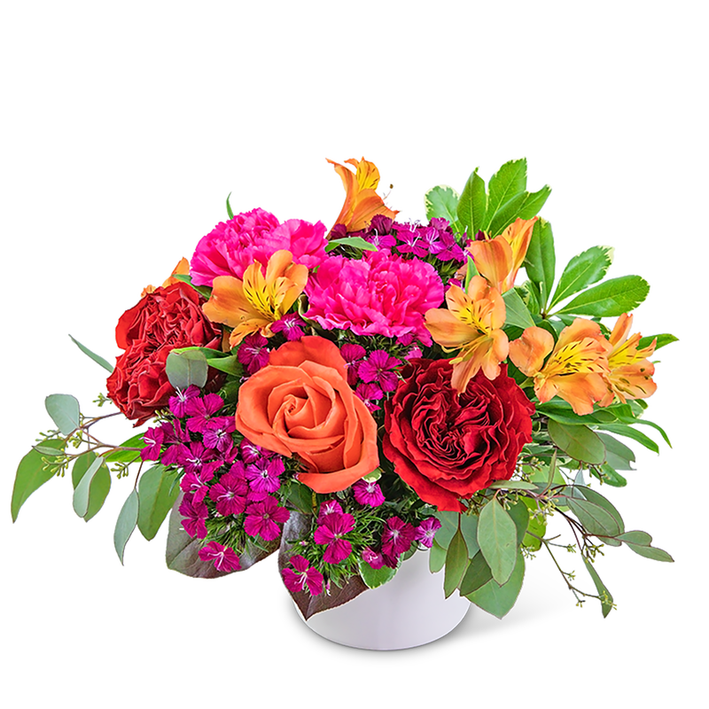Wouldn't it be paradise to receive this colorful arrangement? Must Be Paradise is a vibrant collection of Myra and orange roses, carnations, alstroemeria, and dianthus accented with a variety of foliage in a white ceramic container. This eye-catching piece would add a pop of color to any home or office.