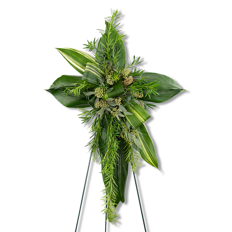 Our Natural Cross standing spray is the perfect symbol of a loved one's faith filled life on earth. A variety of textures in premium foliage combine to make a stunning and organic cross, made to be displayed near the casket or urn. Sympathy flowers are the perfect way to honor a life or send your condolences to the grieving family.
