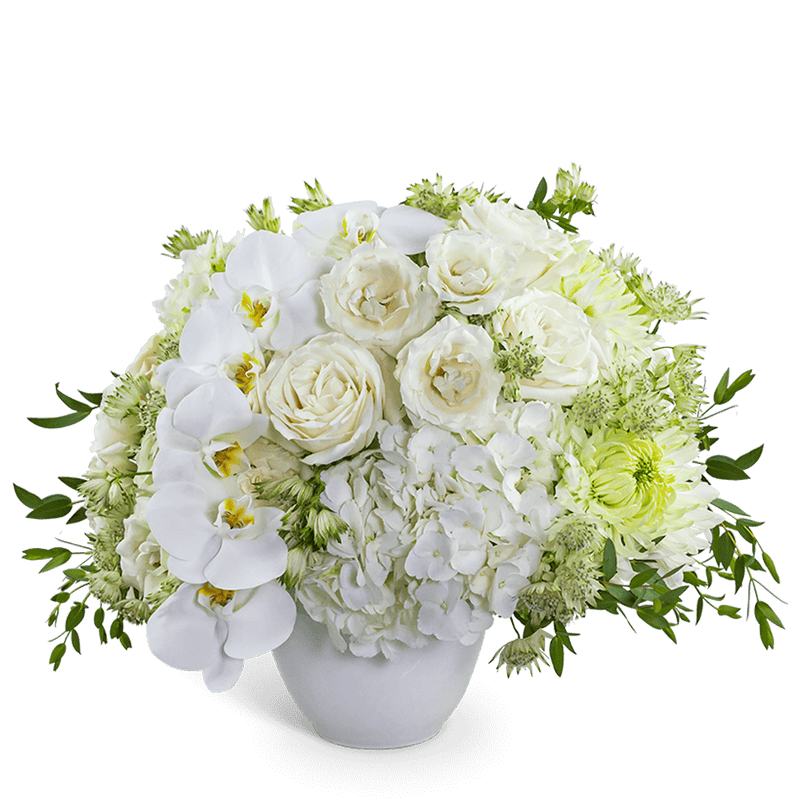 Orchid Clouds is a luxurious all-white arrangement featuring Phalaenopsis Orchids, Roses, Hydrangea, and accent blooms. Designed in a modern ceramic vase, it's perfect for sympathy, anniversaries, or a thoughtful gesture of elegance. Our floral designer may make thoughtful substitutions while maintaining the overall look of the arrangement.