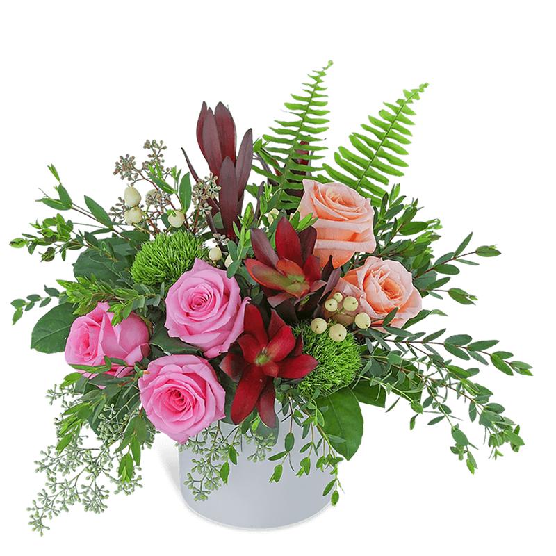 This Organic Impression flower bouquet is absolutely stunning and a customer favorite! The natural, organic foliage and pastel flowers pop in the bright white ceramic container. Its featured flowers include Leucadendron, soft peach and pink roses, hypericum berry, and long-lasting premium foliage. It will look picture perfect on a side table or desk and makes a perfect gift.