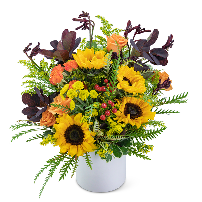 This spectacular bouquet will light up any room! Overflowing with Sunshine is a vibrant collection of roses, sunflowers, kangaroo paw, button spray mums, hypericum berry, solidago, leucodendron, grevelia, and variegated pittosporum. This large arrangement would be perfect for an entryway or dining room table.
