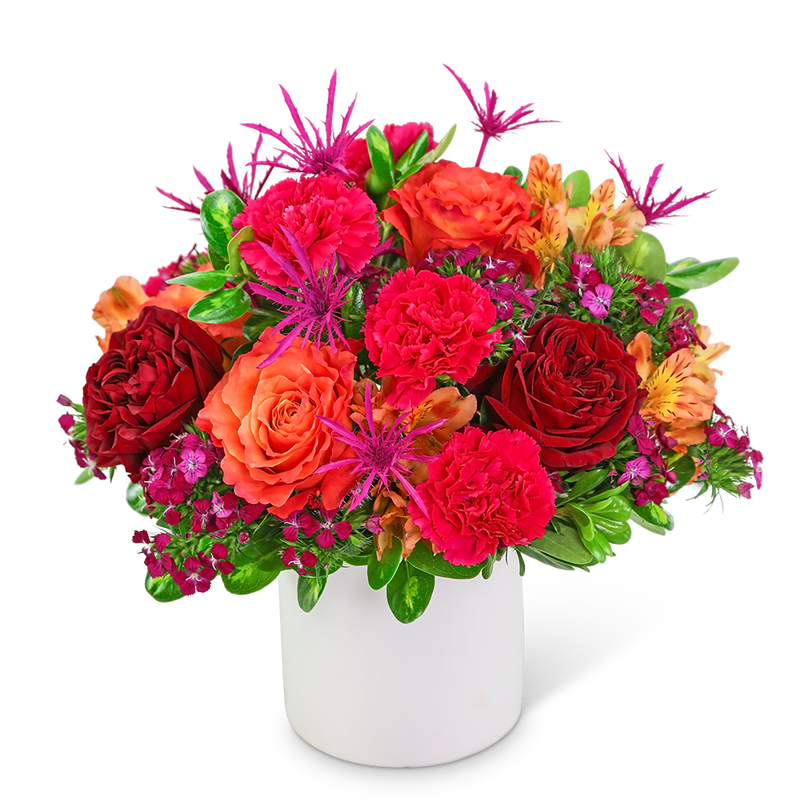 Wouldn't it be paradise to receive this colorful arrangement? Paradise Found is a vibrant collection of red and orange roses, carnations, alstroemeria, and dianthus accented with a variety of foliage in a white ceramic container. This eye-catching design would add a pop of color to any home or office. We offer the freshest flowers and same-day local flower delivery in most cases.