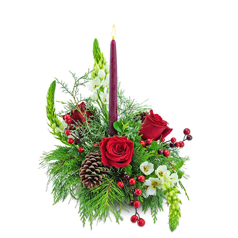 Who wouldn't love to receive this beautiful arrangement? Peaceful Home features roses, Star of Bethlehem, pinecones, berries, and ornaments with assorted evergreen and foliage surrounding a taper candle. This is the perfect gift for this peaceful season.