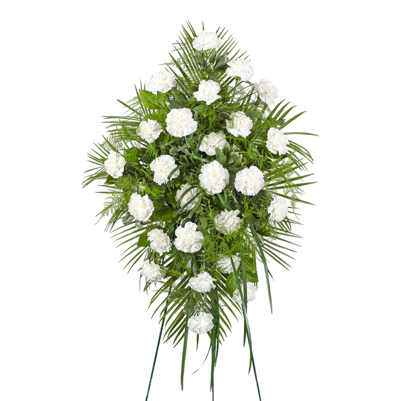 Our Peaceful in White Standing Spray is a serene arrangement showcasing white carnations which symbolize pure love and innocence. Adorned with carnations, plumosa, and other premium foliage, this memorial tribute emanates a sense of peace and tranquility. Whether for a celebration of life or memorial service, this heartfelt standing spray serves as a thoughtful and elegant expression of love and remembrance.