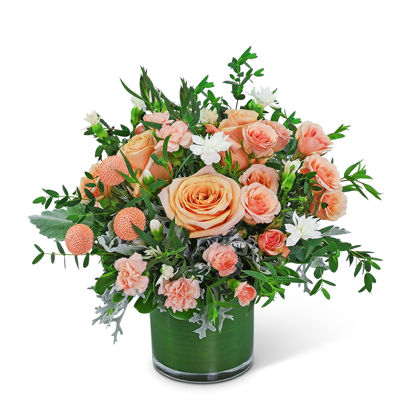 Our Peaches and Cream design is a sweet way to show someone you care. Delicate peach roses bring life to this arrangement, as Carnations, Crespedia, and other premium flowers and foliage fill it out beautifully. If you're looking for a birthday or anniversary gift that really expresses your love, look no further than our Peaches and Cream design.