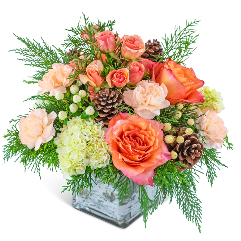Step into a winter wonderland with our Peachy Woodland flower design. Bursting with charm, it showcases the delightful combination of roses, carnations, hypericum berries, hydrangea, evergreen foliage, and pinecones, all artfully arranged in a clear cube vase lined with birch ribbon. With its elegant yet cozy feel, this enchanting floral design is sure to bring warmth and joy to any home or make a thoughtful gift for a loved one.