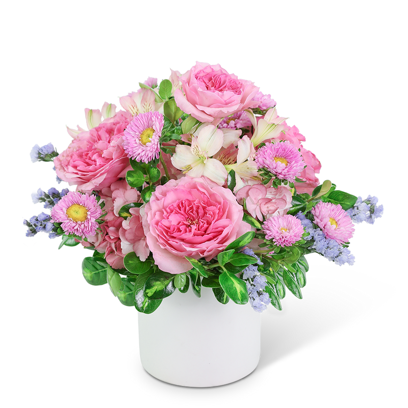 Send your love with this beautiful design, perfect for a birthday, new baby, or housewarming gift. Pink Charm features pink roses, Alstroemeria, and Hydrangea designed in a white cylinder for a delicate look that will make anyone smile. This unique flower design adds the perfect extra pop of pastel color! We can offer same-day flower delivery in most cases. If you are sending the bouquet directly to your recipient, please provide the complete address and contact information so that we can deliver the flowers directly to them.