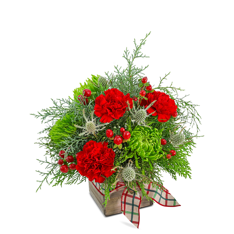 Embrace the spirit of the season with the delightful Plaid Tidings floral design. Featuring vibrant red carnations, Green trick Dianthus, Spider Mums, and lush foliage elegantly presented in a charming wooden cube container, this arrangement exudes rustic holiday charm. Adorned with a festive plaid ribbon, it is a heartwarming addition to any holiday celebration, evoking cozy warmth and timeless joy.