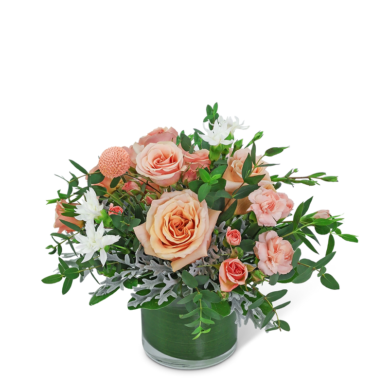 Our Pretty as a Peach design is a sweet way to show someone you care. Delicate peach roses bring life to this arrangement, as Carnations, Crespedia, and other premium flowers and foliage fill it out beautifully. If you're looking for a birthday or new baby gift that really expresses your love, look no further than our Pretty as a Peach design.
