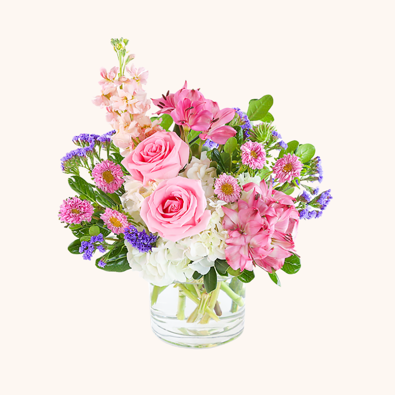 Spread love and joy with our exquisite Cotton Candy Clouds flower design. Delicate pink roses, Alstroemeria, and Hydrangea are artfully arranged in a clear glass vase, creating a beautiful and tender look that is sure to bring a smile to anyone's face. With its pop of pastel colors, this unique flower arrangement is perfect for adding a touch of soft elegance to any occasion.