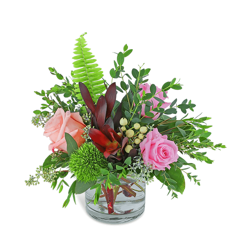 Purely Natural is long-lasting and overflowing with natural beauty! It is a full and lush design that features Leucadendron, soft peach and pink roses, hypericum berry, and premium foliage. A gift of hand-arranged flowers will be sure to impress or add a beautiful elegance to the recipient's home or office space.