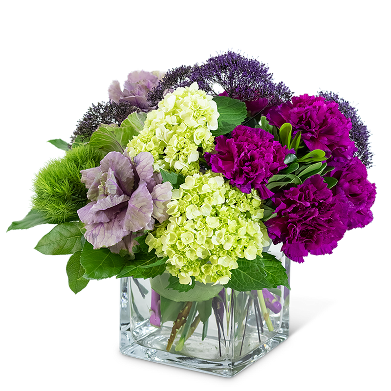 The Purple Reign flower bouquet is a stunning gift for any occasion and is a very popular choice! This elegant design features deep purple carnation, purple kale, mini green hydrangea, green trick dianthus, trichilium, pittosporum, and aralia leaf. It's the perfect accent for an end table or desk and will brighten any room.