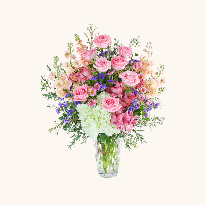 Spread love and joy with our exquisite Queen of the Clouds Flower Design. Delicate pink roses, Alstroemeria, and Hydrangea are artfully arranged in a clear glass vase, creating a beautiful and tender look that is sure to bring a smile to anyone's face. With its pop of pastel colors, this unique flower arrangement is perfect for adding a touch of soft elegance to any occasion.