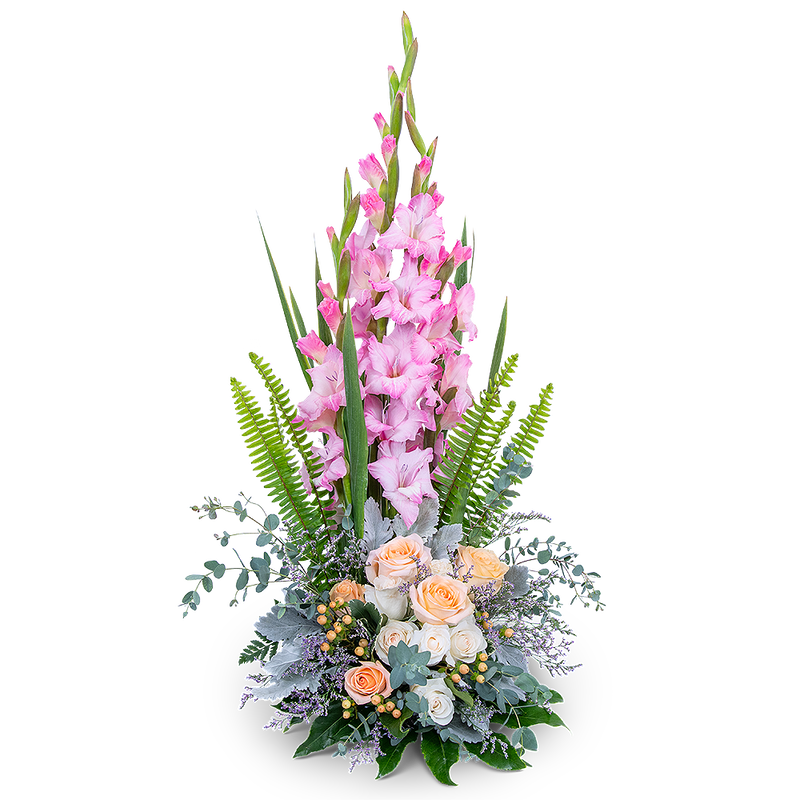Radiant Faith is the perfect tribute or centerpiece for any life celebration. It features roses, Gladiolus, Hypericum Berry, Limonium, Sword Fern, and other premium foliage.