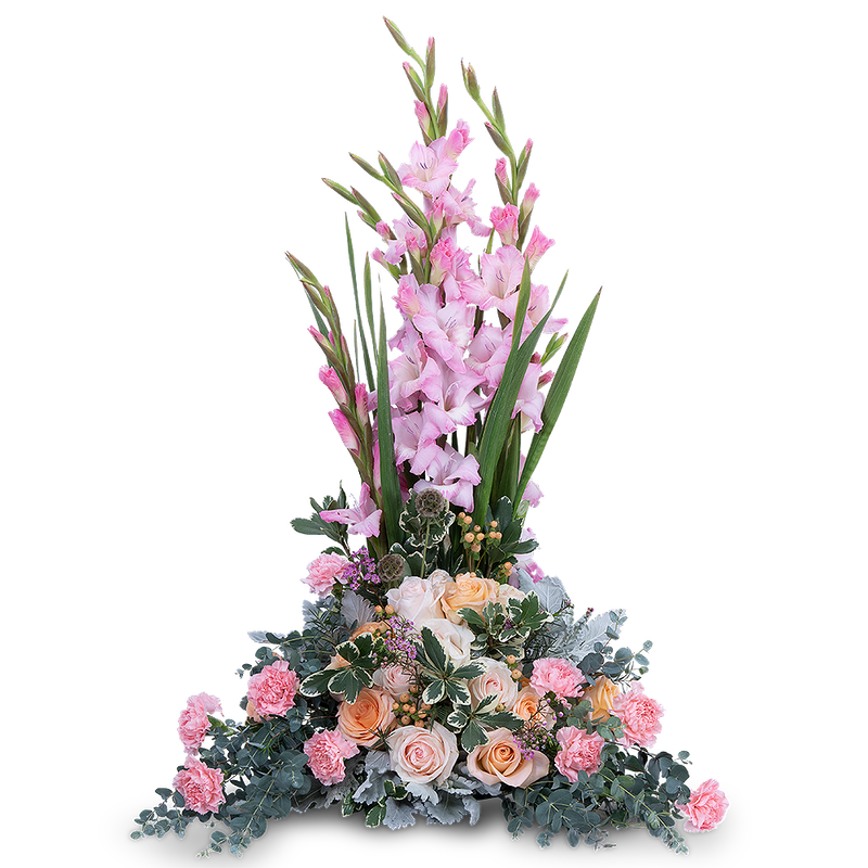 Radiant Hope is the perfect tribute or centerpiece for any life celebration. It features roses, Gladiolus, Carnations, Hypericum Berry, Limonium, Scabiosa Pods, Waxflower, and other premium foliage.