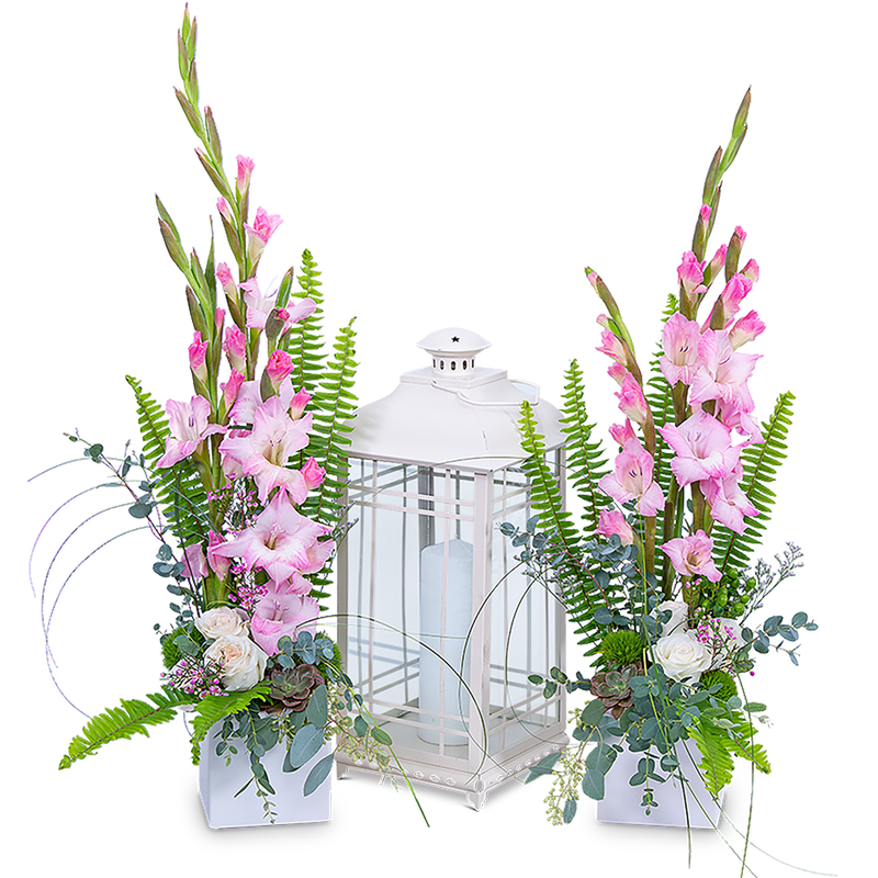Radiant Love is the perfect design or centerpiece for any of life's celebrations. It has a white, keepsake lantern and two beautiful arrangements featuring roses, Gladiolus, Hypericum Berry, Green Trick Dianthus, Sword Fern, Succulents and other premium foliage. Lanterns are often the symbol of peace and light for the days ahead.