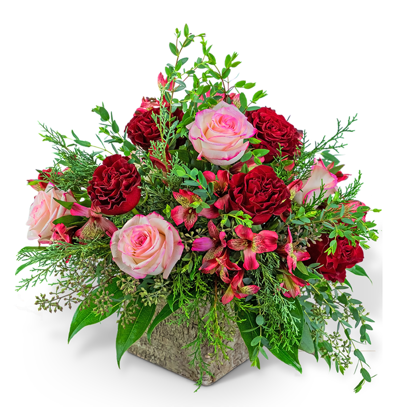 Add a little color to someone's life with this beauty! Ravishing Rouge contains Roses, Alstroemeria, Cocculus, Parvifolia, and Seeded Eucalyptus surrounded by Evergreen and displayed in a charming birch box. This large arrangement will look perfect on any entry or dining table.