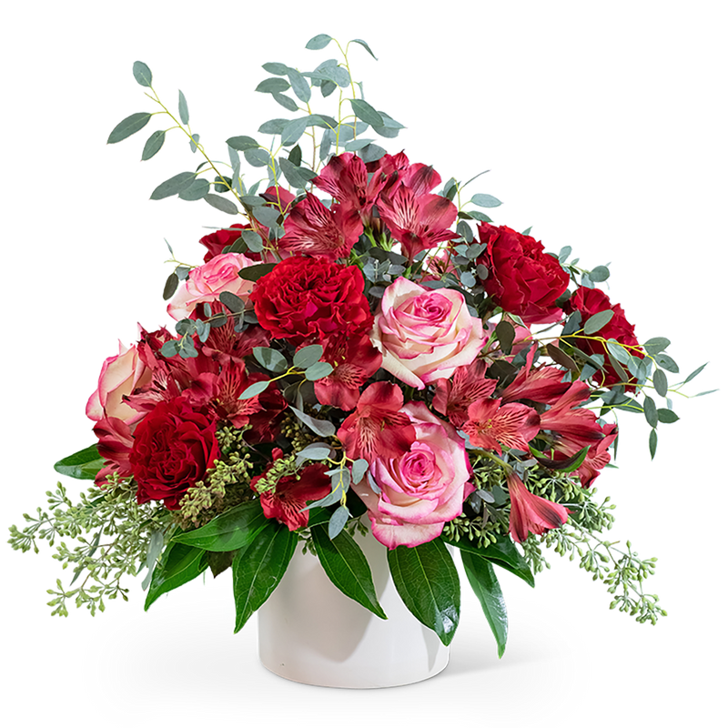 Who doesn't love Red Velvet cake? Our floral version of Red Velvet features pink Paloma and red Myra roses, red alstroemeria and premium foliage. It's a stylish and elegant design, perfect for an Anniversary or Valentine's Day gift, and will bring a touch of romance to any room.