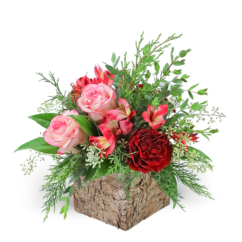 Add a little color to someone's life with this beauty! Refined Rouge contains Roses, Alstroemeria, Cocculus, Parvifolia, and Seeded Eucalyptus surrounded by Evergreen and displayed in a charming birch box. It's the perfect thank you or just because gift.