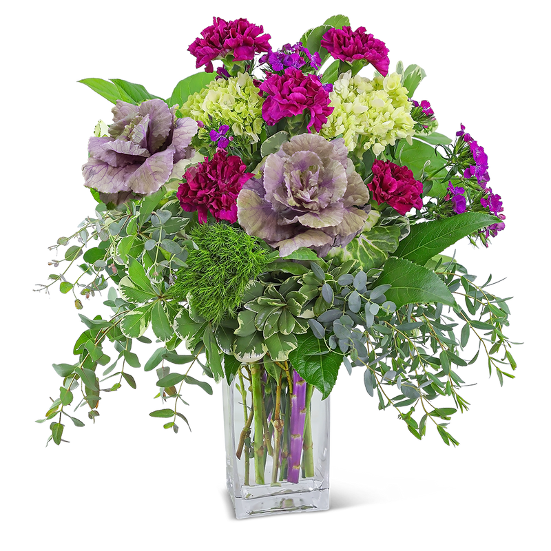The Reign of Beauty flower bouquet is a stunning gift for any occasion and is a very popular choice! This elegant design features Carnations, Kale, Hydrangea, Dianthus, and premium foliage. It's the perfect accent for a dining table and will brighten any room. This spectacular arrangement is hand-designed by our expert florists in a tall clear vase.