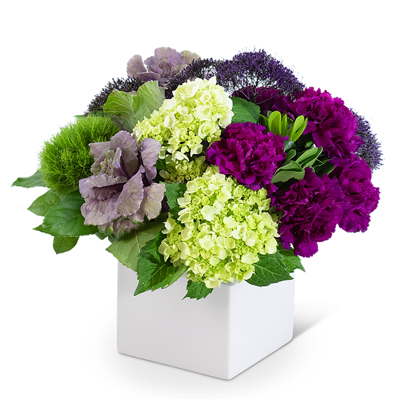Our Reigning Love flower bouquet is a stunning gift for any occasion and is a very popular choice! This elegant and clean design features deep purple carnation, purple kale, mini green hydrangea, green trick dianthus, trichilium, pittosporum, and aralia leaf. It's the perfect accent for an end table or desk and will brighten any room.