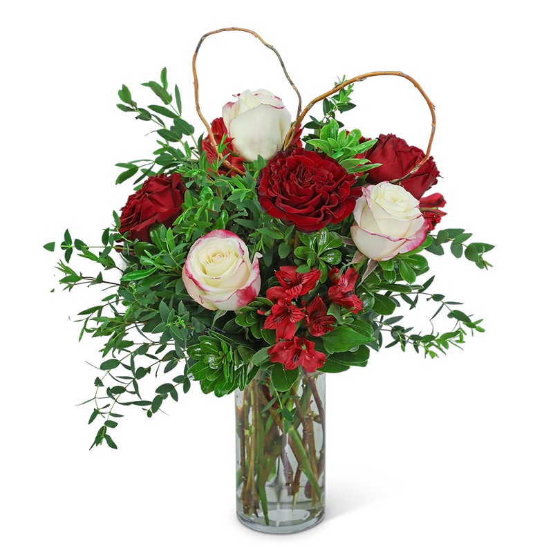 This gorgeous design is hand-arranged by our professional floral designers and delivered in a lovely vase. The rich, romantic colors of Road to Romance are sure to melt the heart of your loved one. Beautiful ruffly roses, alstroemeria, and premium foliage are artfully arranged with a natural heart accent nestled in. Flower delivery has never been easier or more appreciated. Whether you are looking for a birthday, anniversary, or valentines day gift, we have flowers that are sure to fit the occasion!