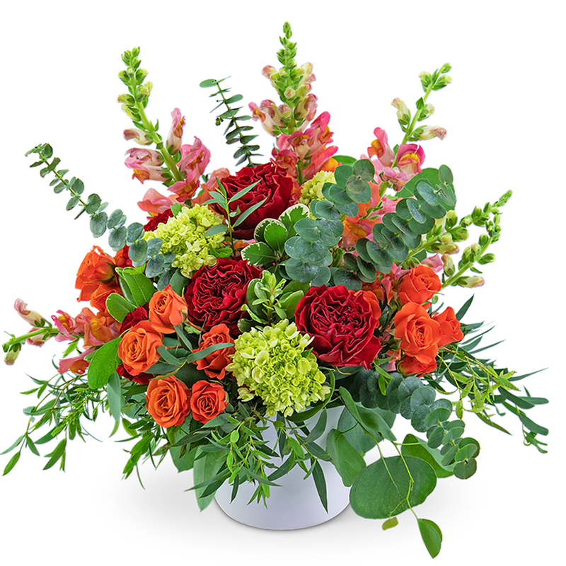 Rockin' Rio will bring a sizzle to any occasion! It features roses, snapdragons, hydrangea, pittosporum, eucalyptus, and parvifolia in a modern white container. The deep reds, oranges, and pinks of this arrangement will add just the right touch of warmth to any coffee or dining room table.