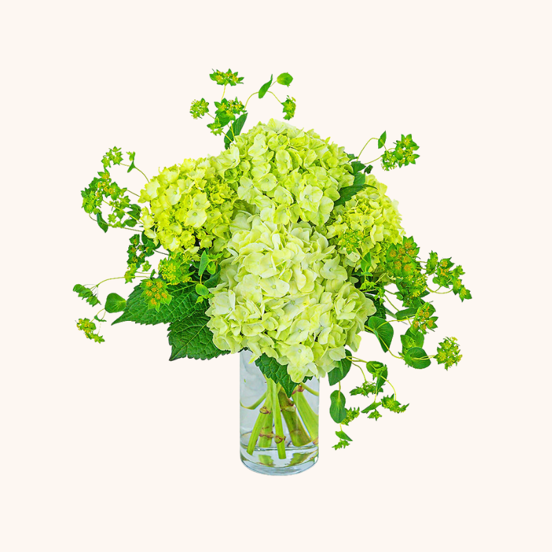 A beautiful bouquet with Hydrangea is a classic and timeless flower arrangement for any occasion. Green Glow simply features beautiful green Hydrangeas accented with Bupleurum in a clear vase. Our Floral Shop specializes in local flower delivery, so let us make someone's day with our beautiful Hydrangea bouquet delivered right to their front door or office. Approximately 13" H x 13" W