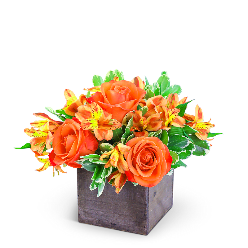 Rosy Tangerine includes an assortment of long-lasting Roses, Alstroemeria, and premium foliage. It brings together bright, bold colors of orange and green to create a stunning display in a rustic wood box container. Our hand-designed arrangement is a classic way to send your best wishes and is perfect for any occasion. Energize your day with the bright, fresh colors of Rosy Tangerine Twist.