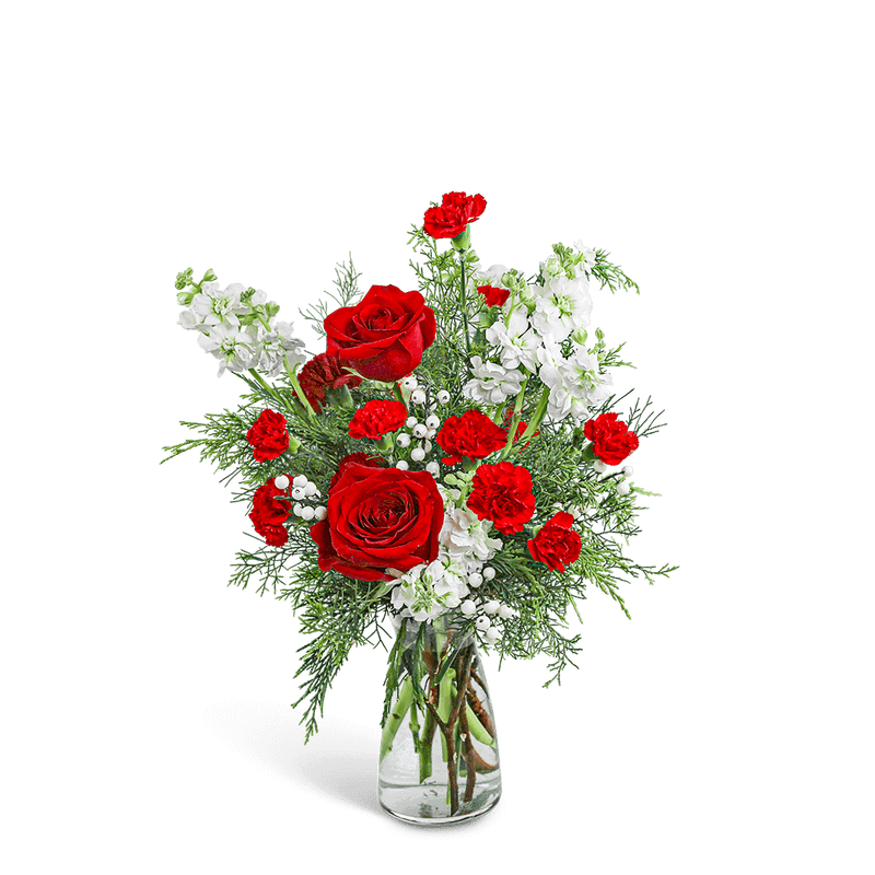 Snow-Kissed Vibe is a charming winter arrangement filled with Roses, Stock, Miniature Carnations, Berries, and lush seasonal foliage. Its fresh, frosty feel makes it perfect for holiday gatherings or a thoughtful flower delivery.
