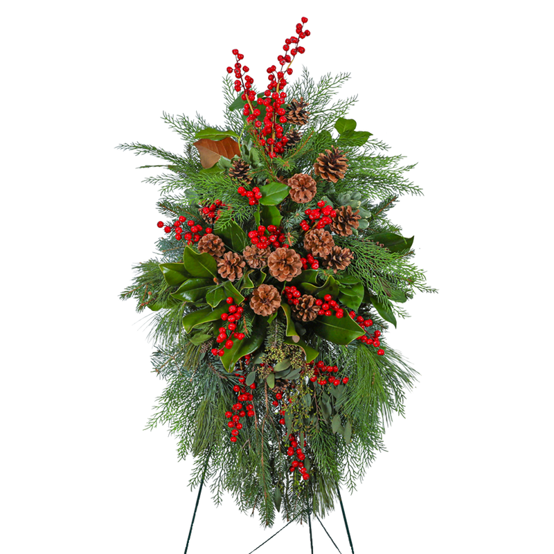 Our Spirit in the Sky Standing Spray is a captivating memorial spray adorned with magnolia, eucalyptus, assorted evergreen, pine, red berries, and pinecones. The deep green hues and natural elements evoke a sense of tranquility and connection to the beauty of the forest. This standing spray serves as a peaceful and timeless tribute, honoring your loved one with the serenity of a woodland sanctuary.
