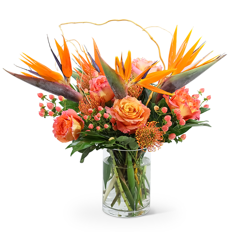 Is there anything better than a warm day in the tropics? What better way to spread warmth than to send Spirit of the Tropics to your loved one? This design features unique Birds of Paradise, pincushion protea, free spirit roses, hypericum berry, curly willow, and premium greens. All of these elements combine to create a truly tropical experience!