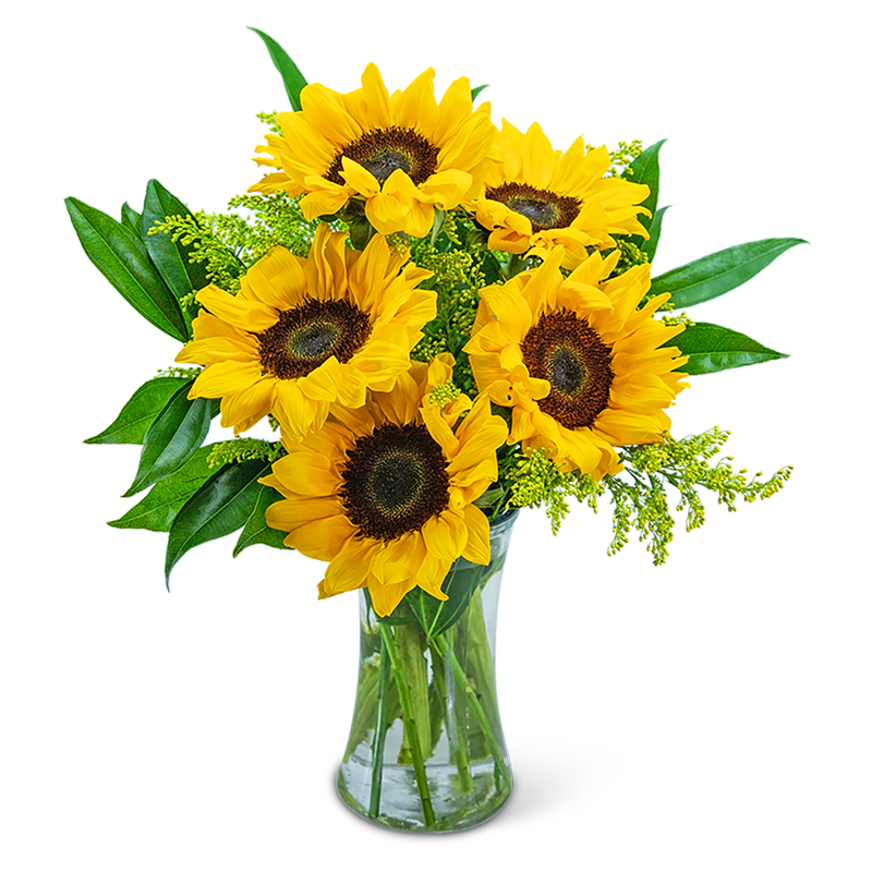 Sprinkle a little happiness into someone's day! This beautiful arrangement of sunflowers in a clear glass vase will bring a glow to any occasion. Sprinkle of Sunshine is the perfect way to send your warmest wishes to friends, family, and loved ones.