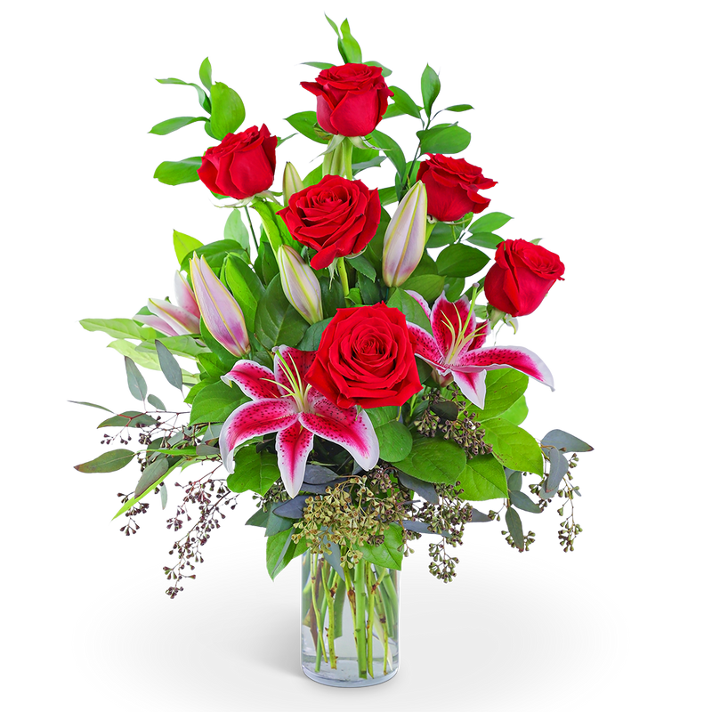 Stars in My Eyes is a beautiful design, perfect for showing your affection to that special someone. It features red roses, stargazer lilies, and premium foliage, all designed in a clear glass vase that will show well on a dining room table, desk, or end table. It is the perfect gift for Valentine's Day, a special Anniversary present, or to just send a reminder of your love.